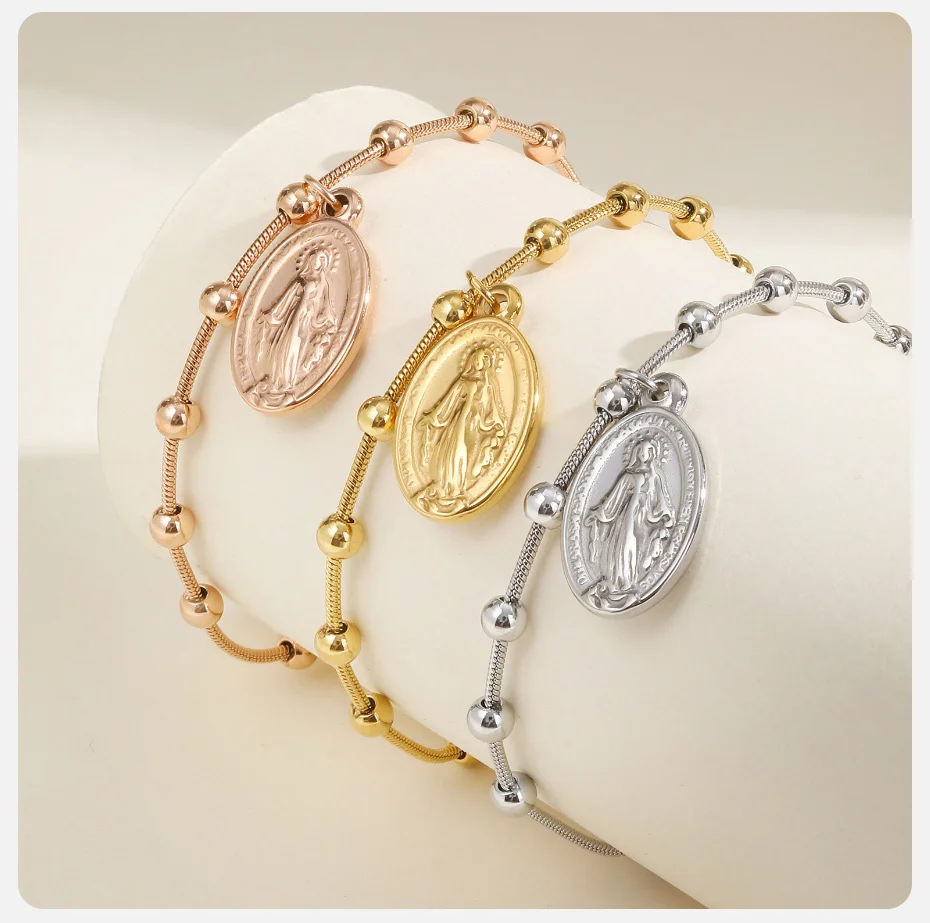 Entretejida en esta pulsera encontrarás cuentas estilo rosario, un delicado dije de cruz y una medalla luminosa de La Virgen—cada detalle es un susurro de fe, devoción y resistencia. En la tradición mexicana, ella no es solo la Virgen María del catolicismo, sino una manifestación radiante de la energía femenina sagrada—honrada con ritual, oración y raíces ancestrales.