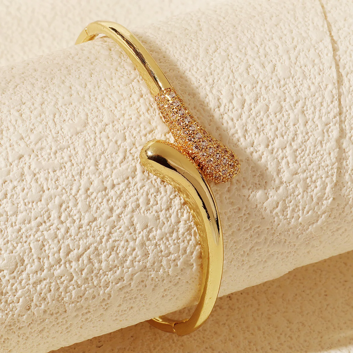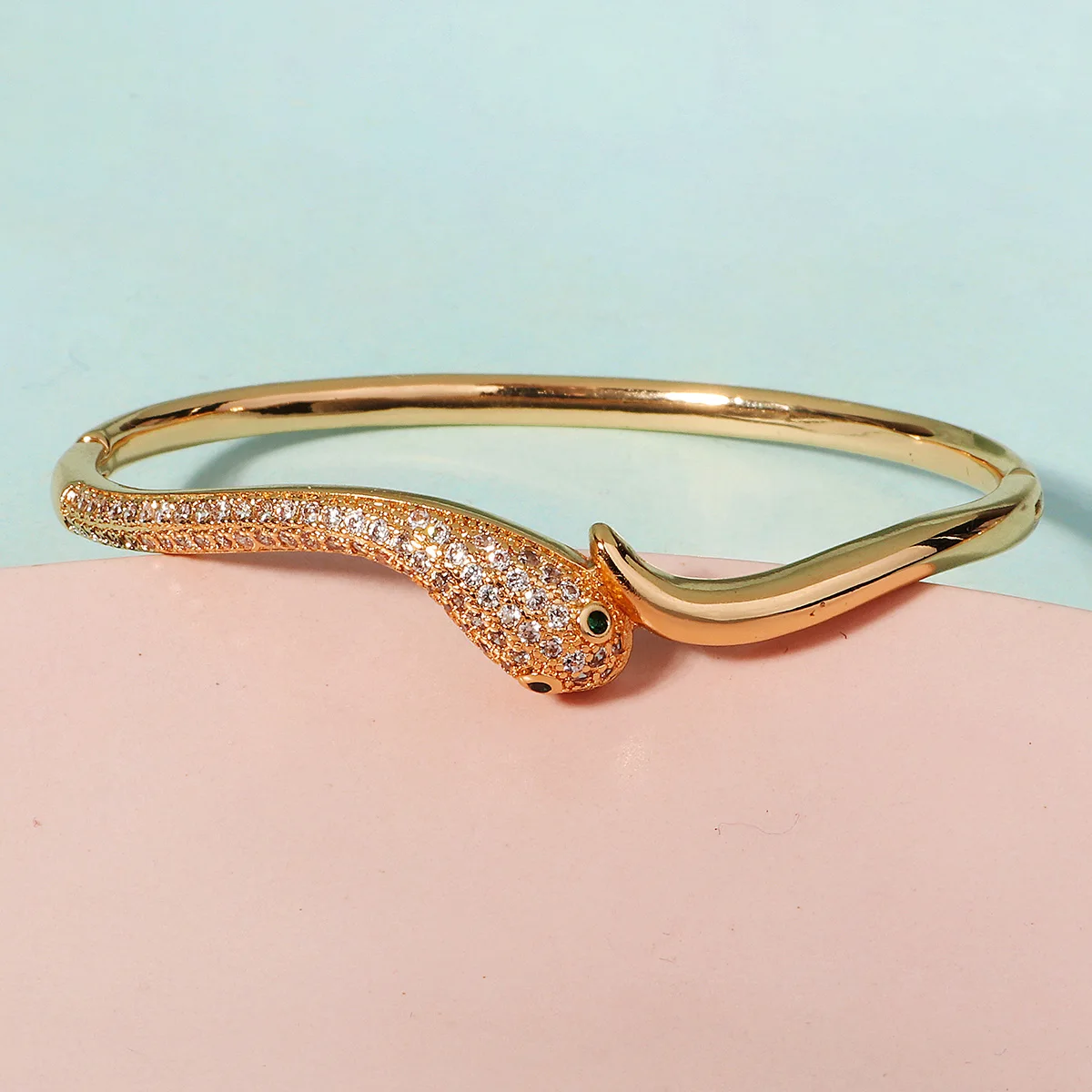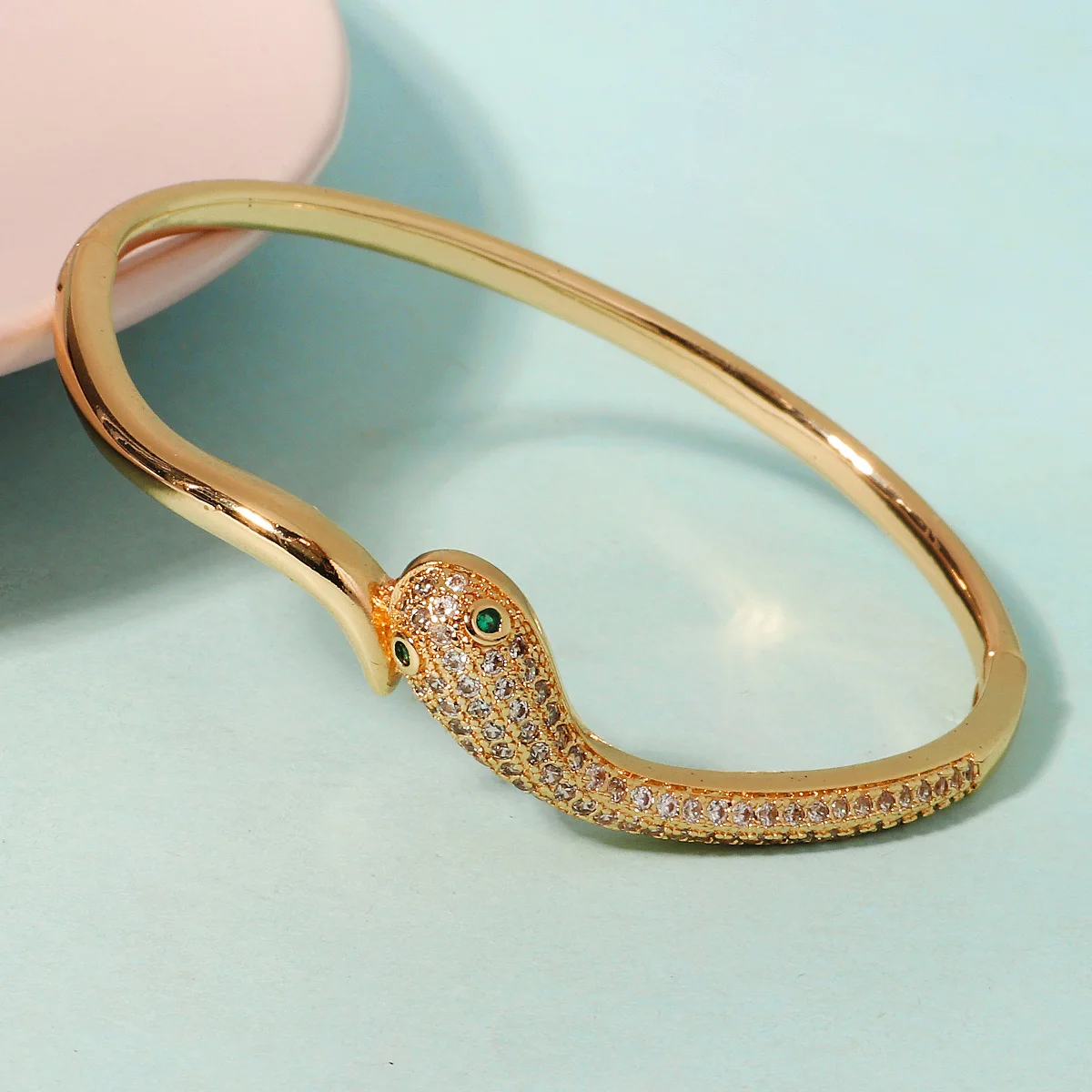 This golden serpent bangle blends elegance with strength. Its curved design, sleek as a serpent in motion, wraps firmly around the wrist like a guardian of resilience and protection.